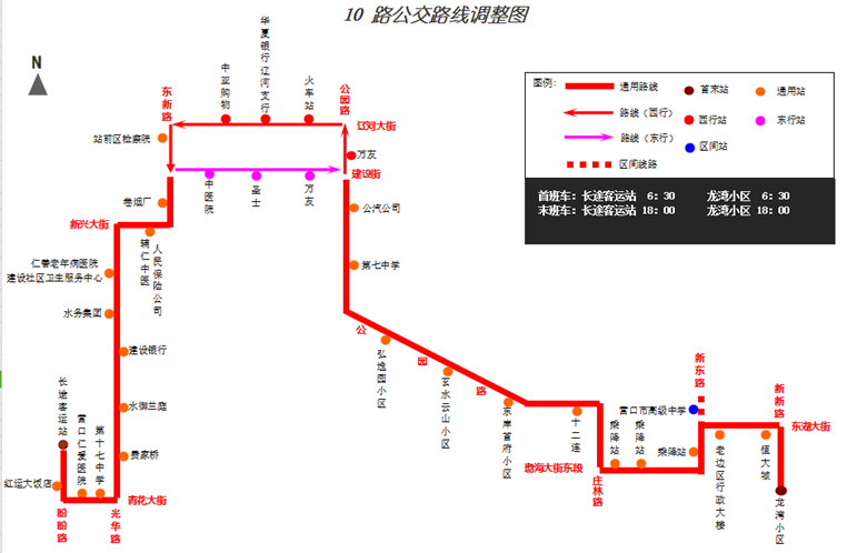 調(diào)整后:“龍灣小區(qū)”—東湖大街 —“乘降站”—新東路—原線—遼河大街/建設(shè)街—原線—盼盼路—“長途客運(yùn)站”。