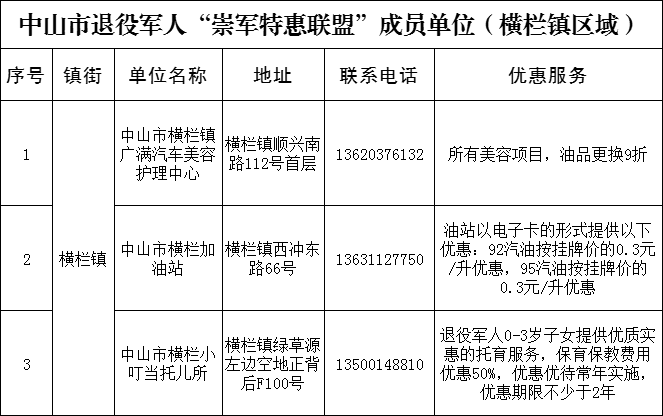 企業(yè)、商家正在了解如何加入“崇軍特惠聯(lián)盟” 中山市“崇軍特惠聯(lián)盟”的招募活動正在進行中,歡迎廣大企業(yè)踴躍報名,用實際行動,為中山退役軍人和軍屬獻出一份堅實力量。 橫欄鎮(zhèn)區(qū)域咨詢電話:0760-87768102 |